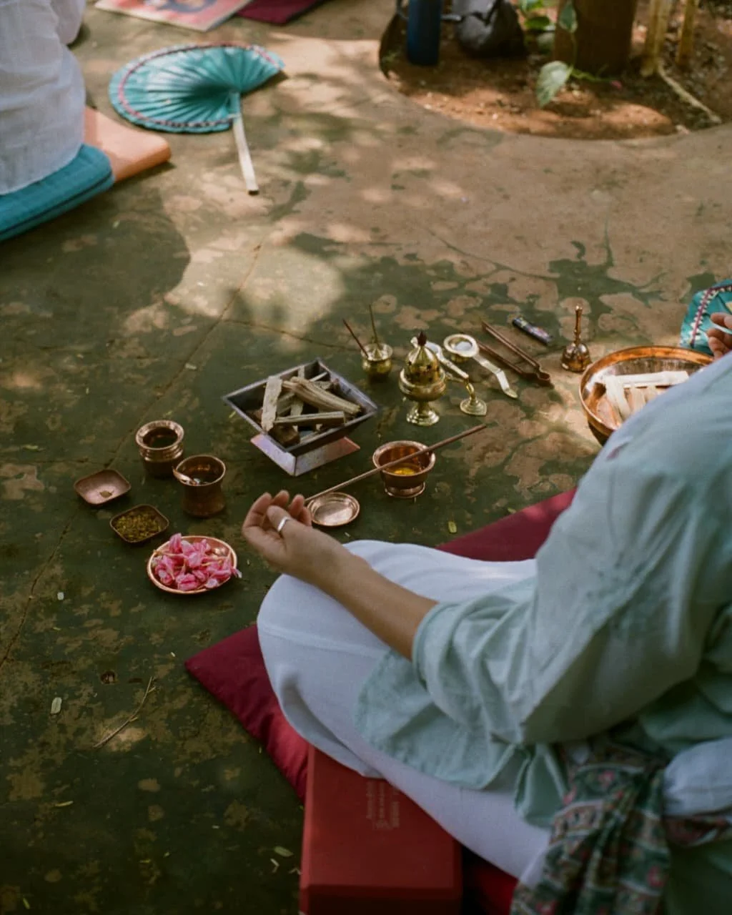 This is not a symbolic or improvised practice. It follows a clear and time-tested structure using mantra, gesture, exact timing, natural materials, and conscious offering. Each element has a function, working together as a coherent system.